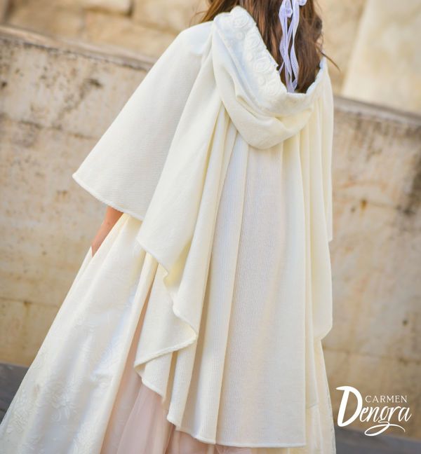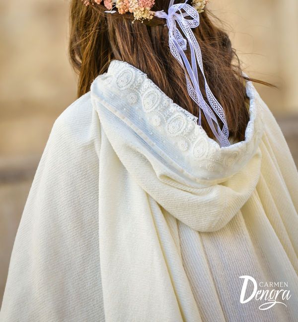 Posibilidad de escoger sin encaje de tul bordado. En tal caso el lazo frontal para atar será del mismo tejido de la capa.