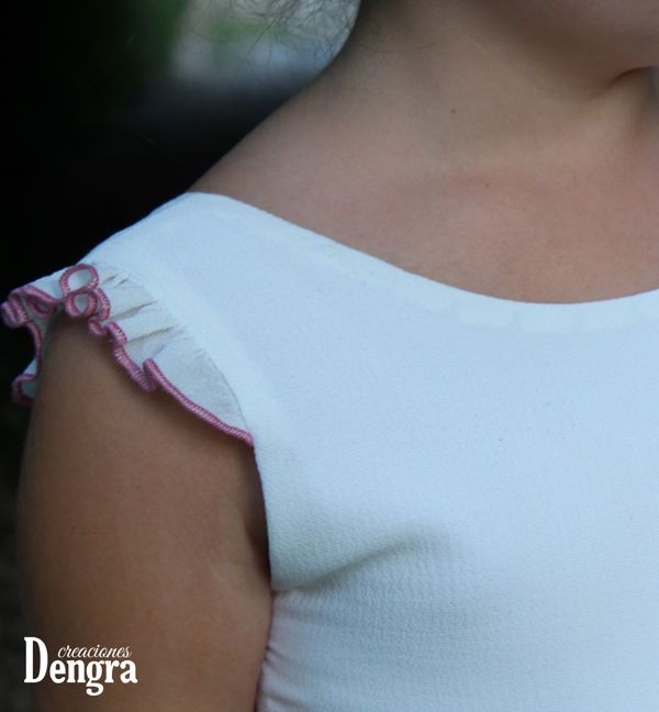 Volantito en los hombros con terminación al tono de la lazada de la cintura
